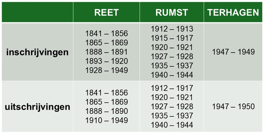 Rumesta heeft een inventaris van verhuizingsformulieren (inschrijvingen en uitschrijvingen) van de drie deelgemeenten van de gemeente Rumst. De jaartallen waarover we beschikken, zijn samengevat in de onderstaande tabel.